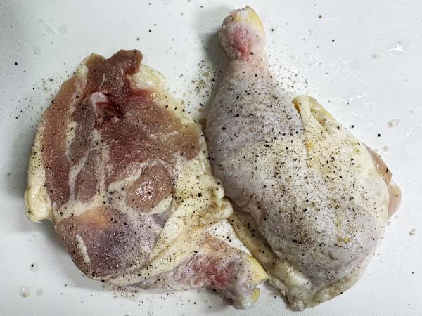 鶏肉に数か所刺します。両面に塩コショウをふりかけてすり込みます。