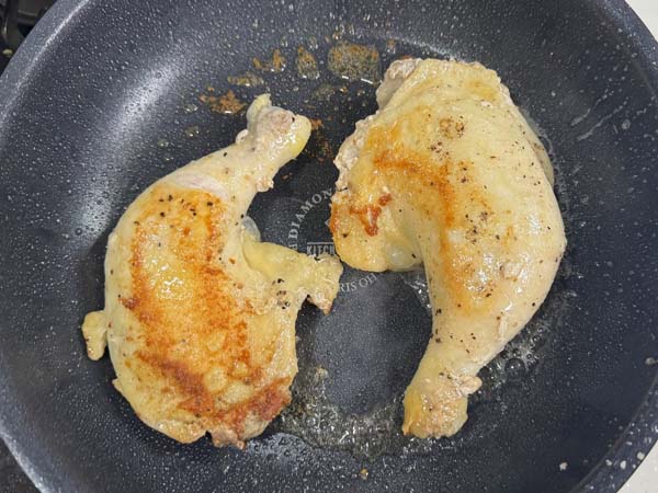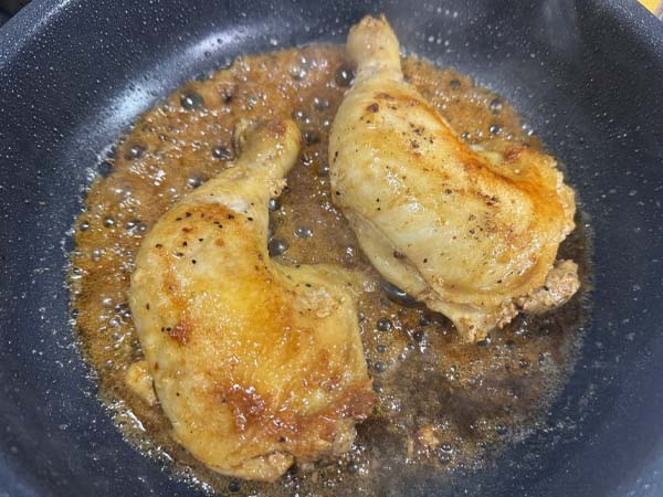 チキンを焼くのは皮目から7分程度中火でフタして焼いていき、裏返して再び7分程度焼くのがポイント!