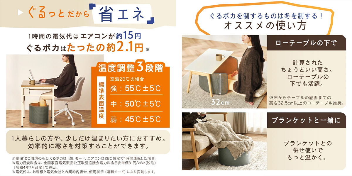 パネルサイズの高さは約32cmなので椅子に座りながら掘りごたつ感覚になるので会社でも活躍できるかと思います。ぜったいブランケットといっしょに使うことをおすすめします!